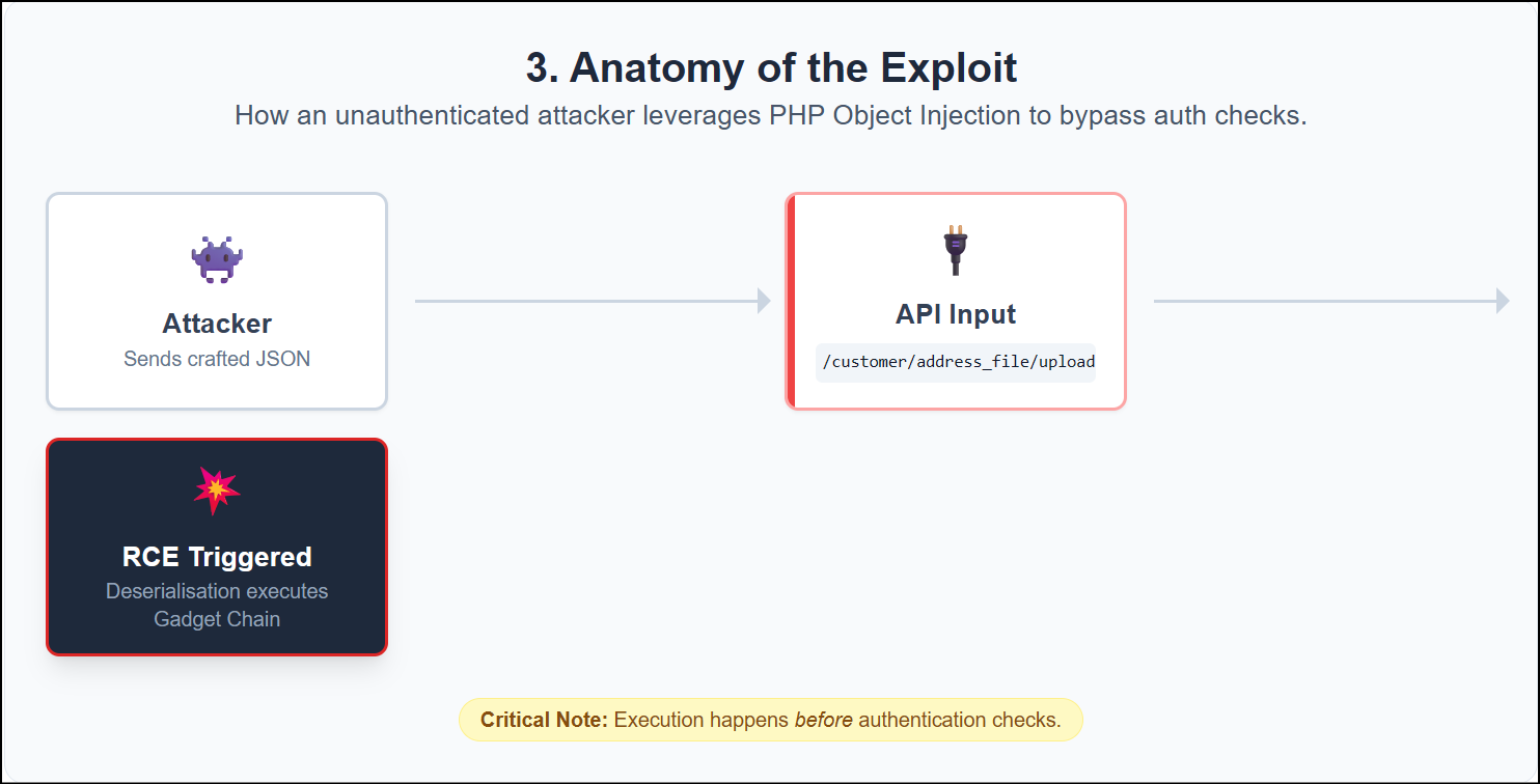 Attackers send fake data to specific API endpoints (like /customer/address_file/upload). The system trusts this input. It then runs malicious commands hidden inside the data.
