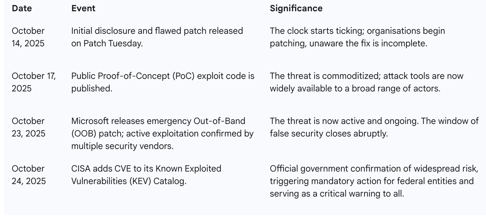 However, because that initial patch was incomplete, this state of compliance was a dangerous illusion. The organisation was, in fact, still completely vulnerable. The period between October 14 and the release of the emergency patch on October 23 was a window of false security. During this time, the publication of a PoC exploit on October 17 dramatically lowered the technical barrier for attackers.8 When active exploitation began on October 23, these "compliant" organisations were just as exposed as those who had not patched at all.